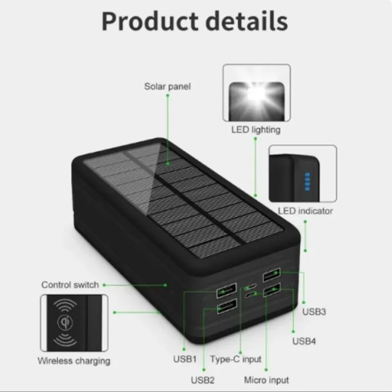 Mit seinen Optionen mit hoher Kapazität, mehreren Lade möglichkeiten und einer Solar lade funktion ist unsere Super-Schnelllade-Solar bank der ultimative Lade begleiter für Outdoor-Abenteuer und den täglichen Gebrauch. Verpassen Sie nicht, bestellen Sie jetzt und bleiben Sie in Verbindung, wo immer Sie sind!