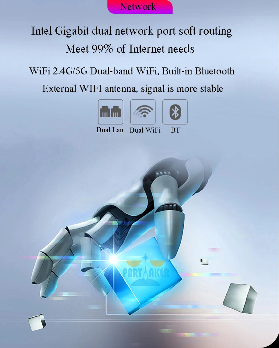 - Support 2*Intel Gigabit RJ45 Lans+M.2 2230 2.4G/5G Dual band AC WiFi/Bluetooth