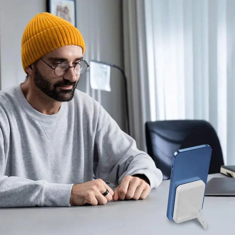 1.Foldable Stand: Make calls, take photos and stay connected on-the-with our magnetic power bank. Its compact, lightweight design is equipped with a practical foldable stand for hands-free multitasking. Keep your phone charged wirelessly and enjoy hassle-free conversations and photos with convenience.