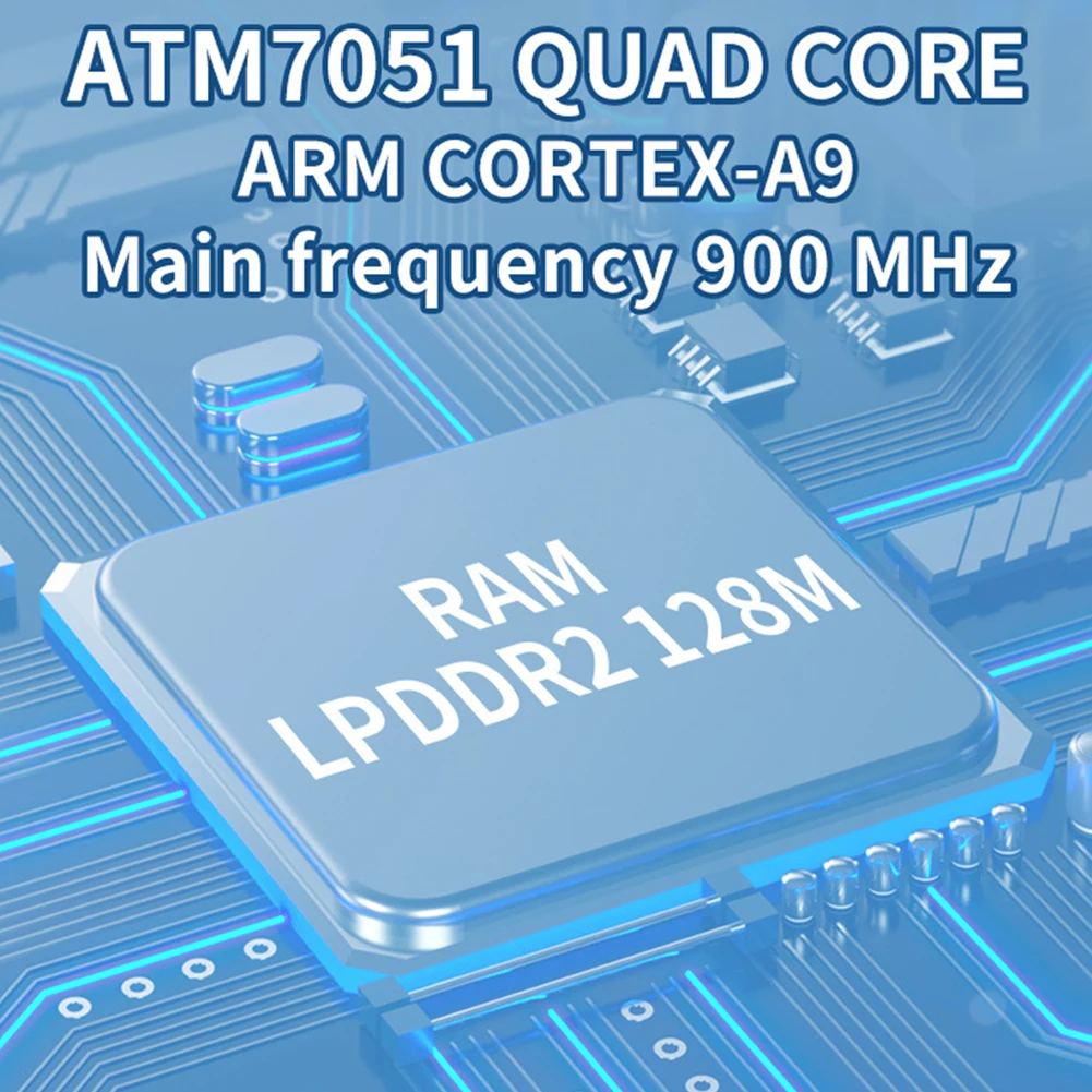 CPU: ATM7051 quad-core arm cortex-A9, clock frequency of 900 MHz;